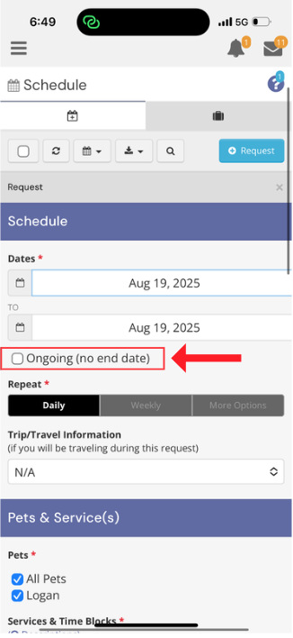 Scheduling an ongoing service series follows the exact same first steps as booking a single service – log in, click , and fill out the pet and service details. The only difference comes in the Dates section where you’ll check the